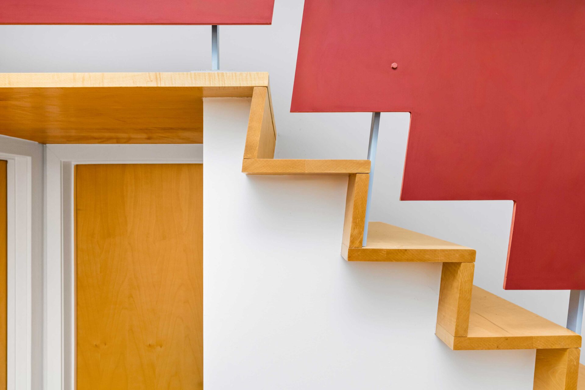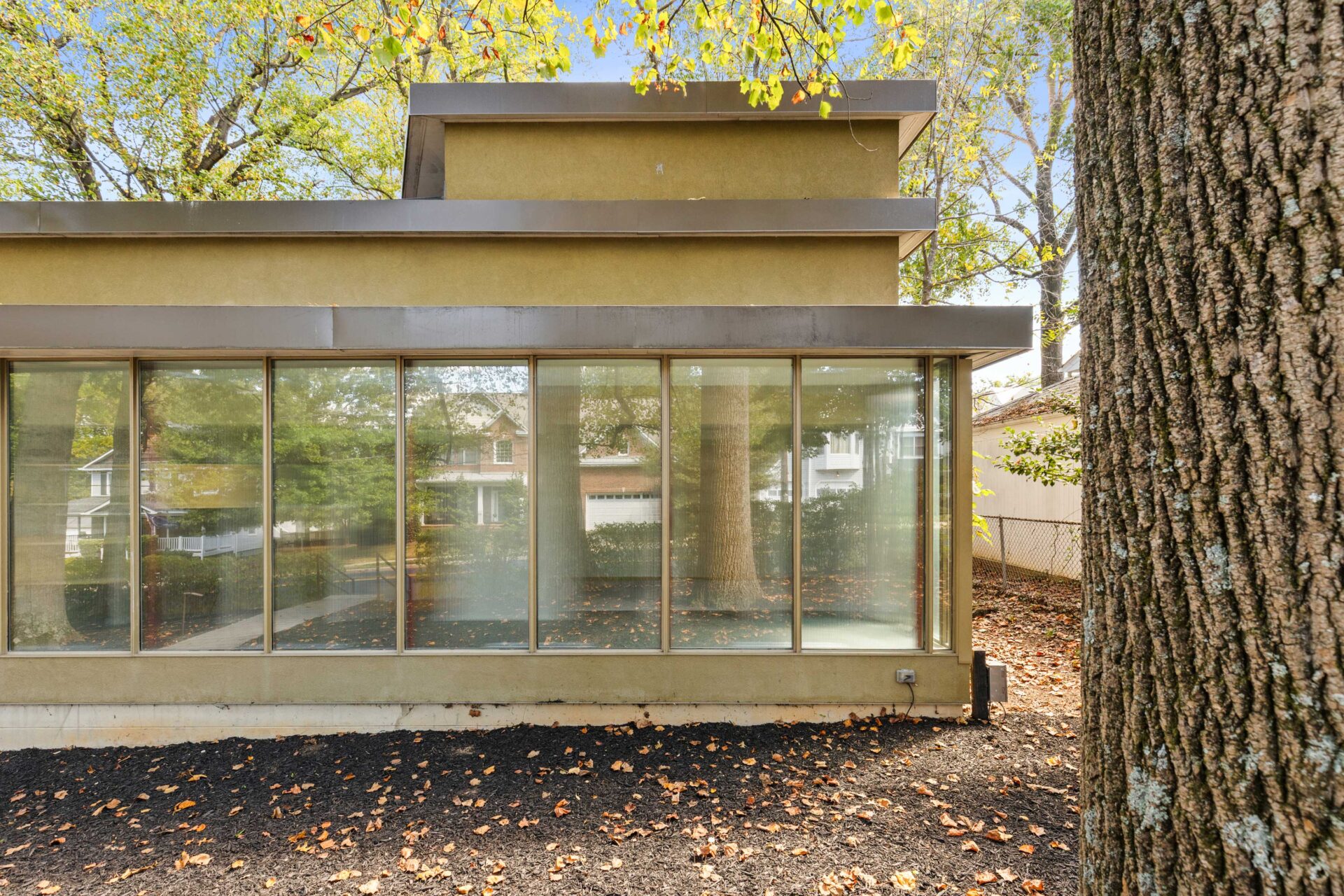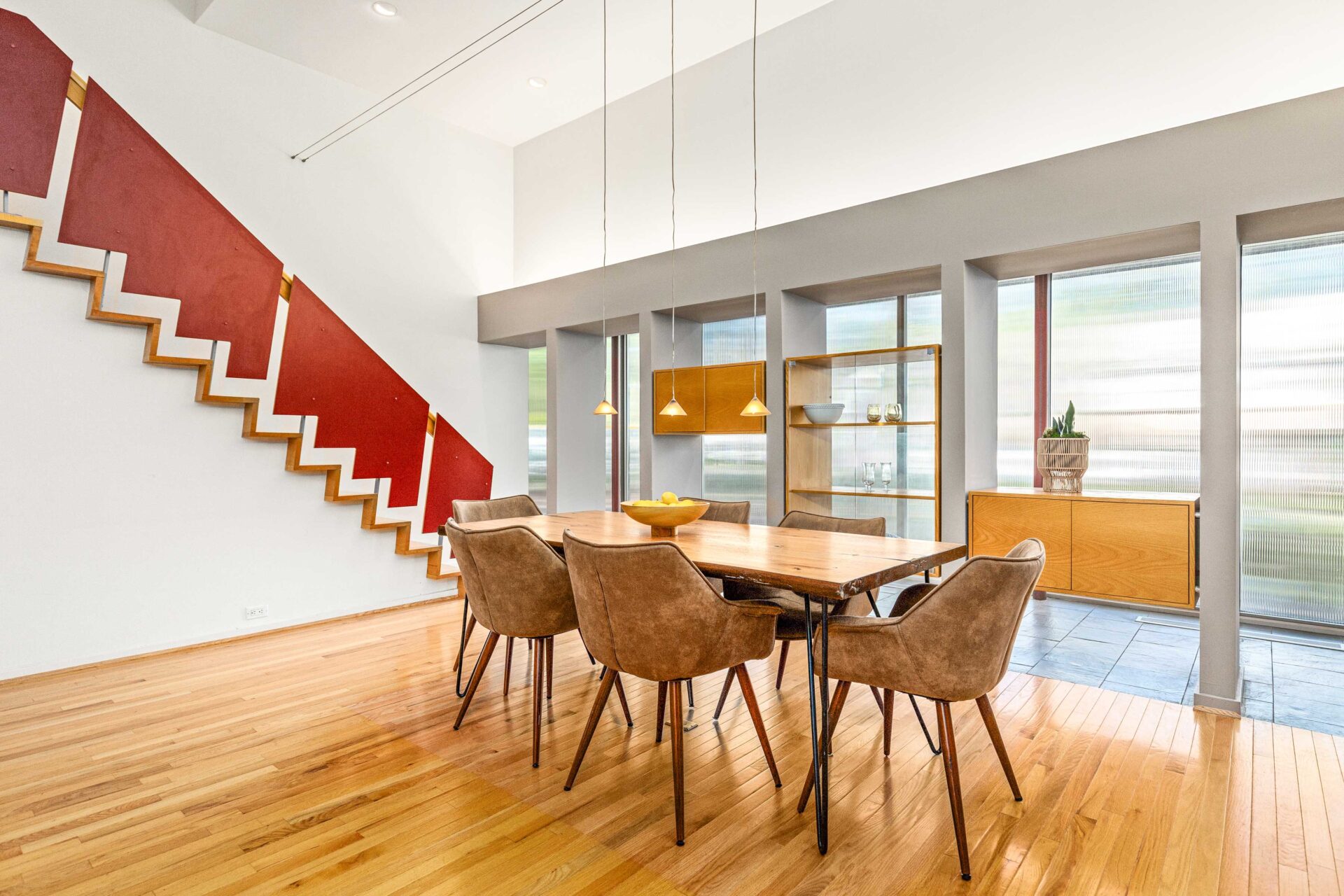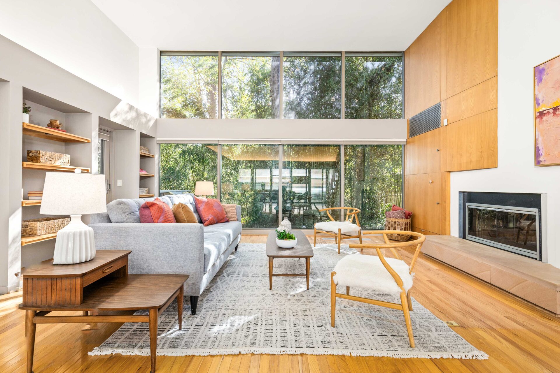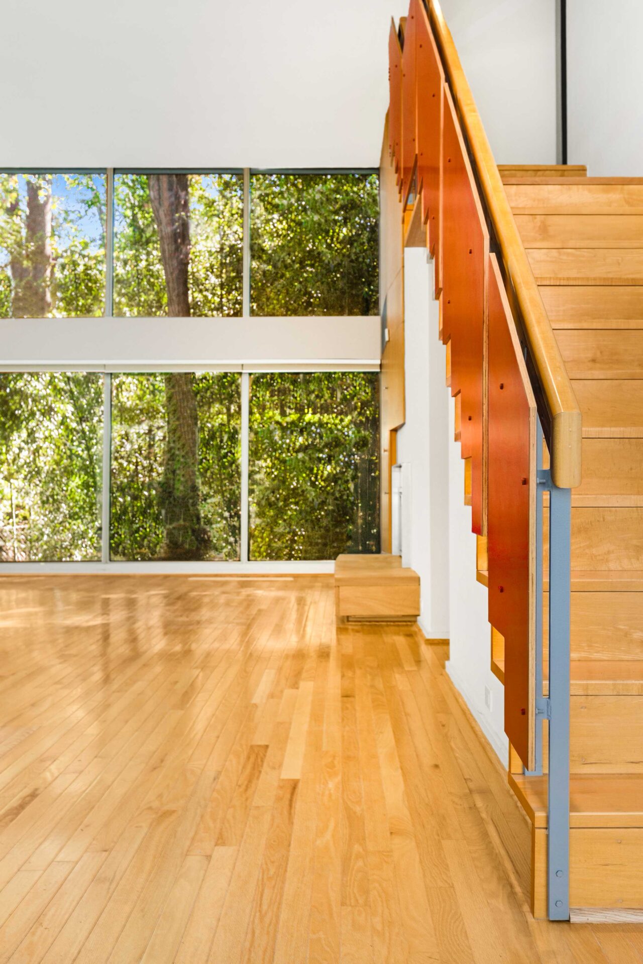 The East wall of the room is floor to ceiling glass looking onto a bamboo thicket. Architectural details such as the unique stair and railing feature up to the primary suite, complete the composition.