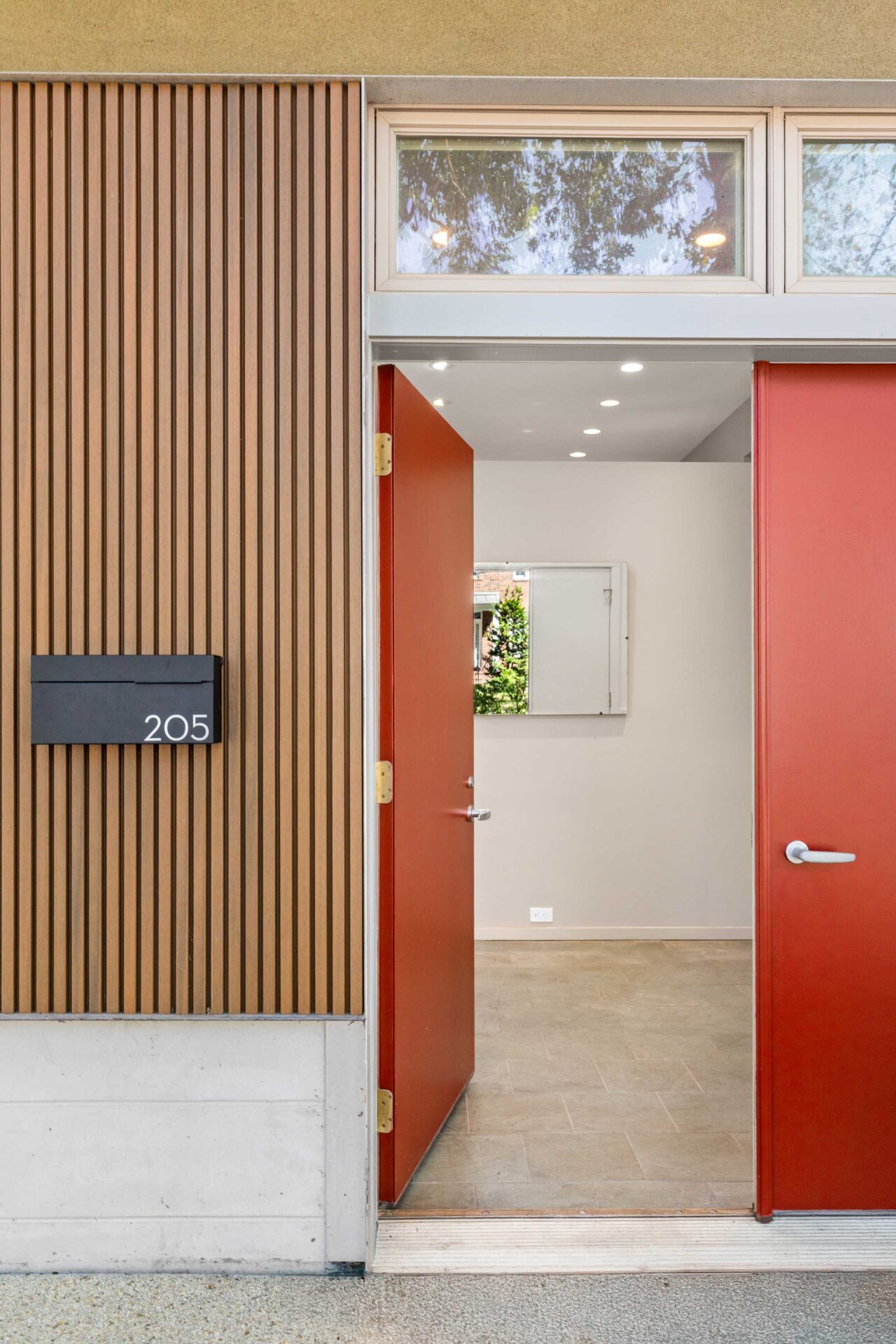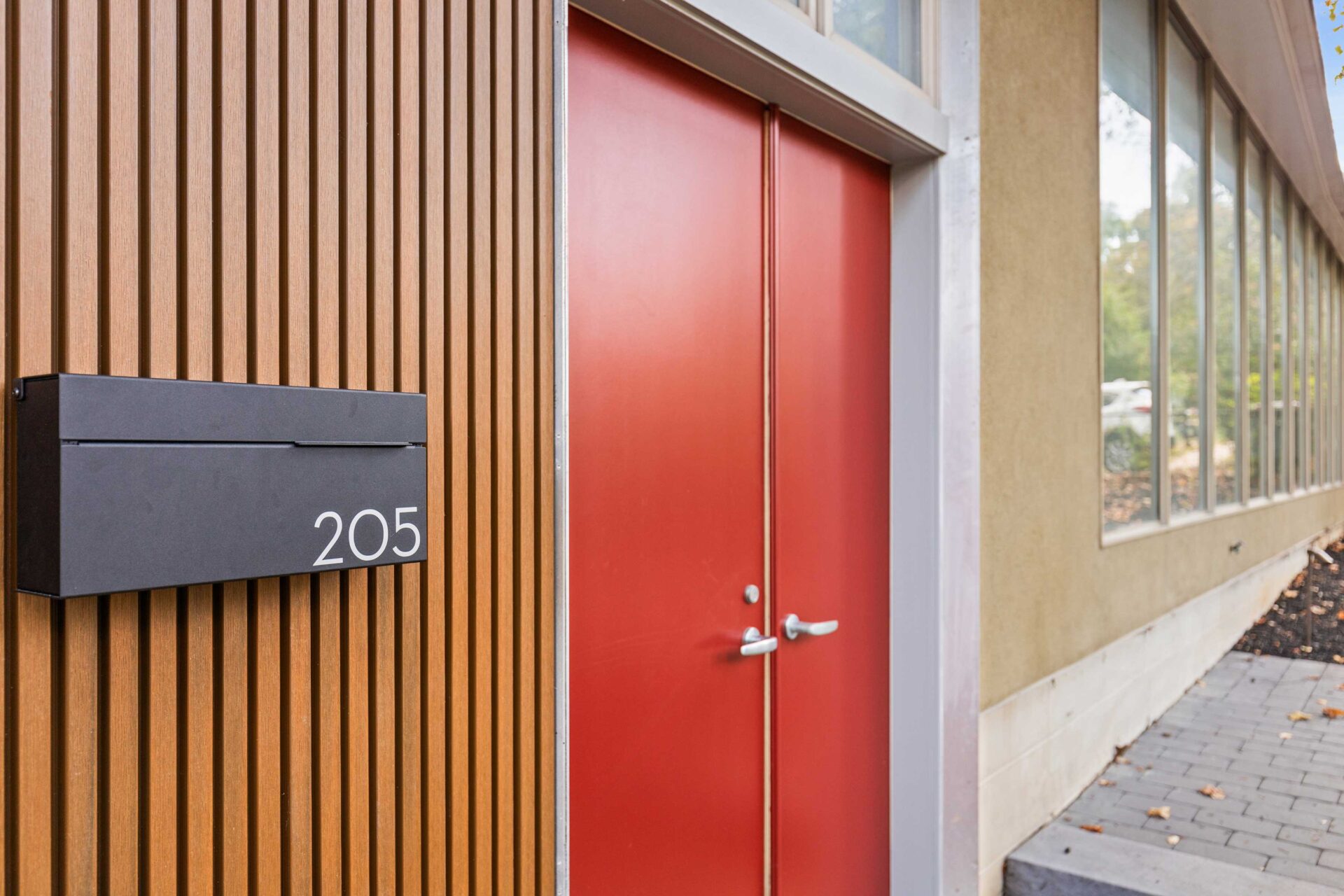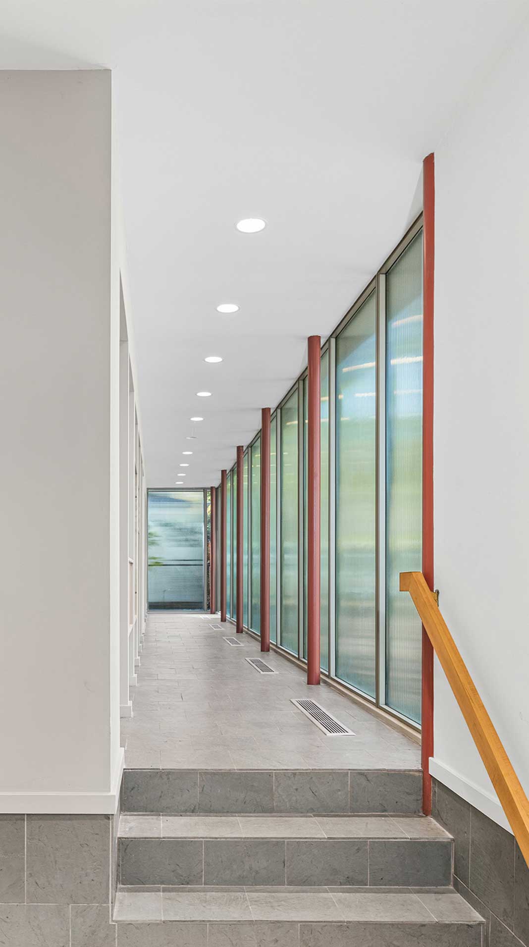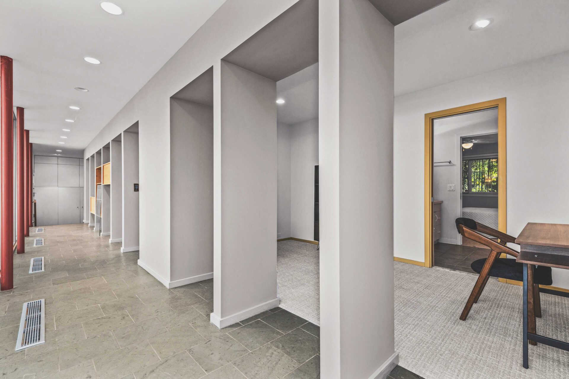 This empty nester home was designed to provide maximum light and openness compared to the rambler the couple had lived in previously. On this shallow and treed lot, the twin challenge became how to achieve this openness and maintain privacy. Facing West and the street, we created a 35ft long corridor with floor to ceiling reeded glass panels. The effect is a striking obscuring of motion both from within and out. This hallway as well as the kitchen are separated from the heart of the home with a thick arched wall, serving various functions, both practical and aesthetic. Within this wall you will find modular custom cabinetry to suit different uses, shelter for a spare chair, light shelf and circulation. Once you pass through the arches you arrive in the dining and living rooms which are 13ft high. The entire space is illuminated with indirect light.