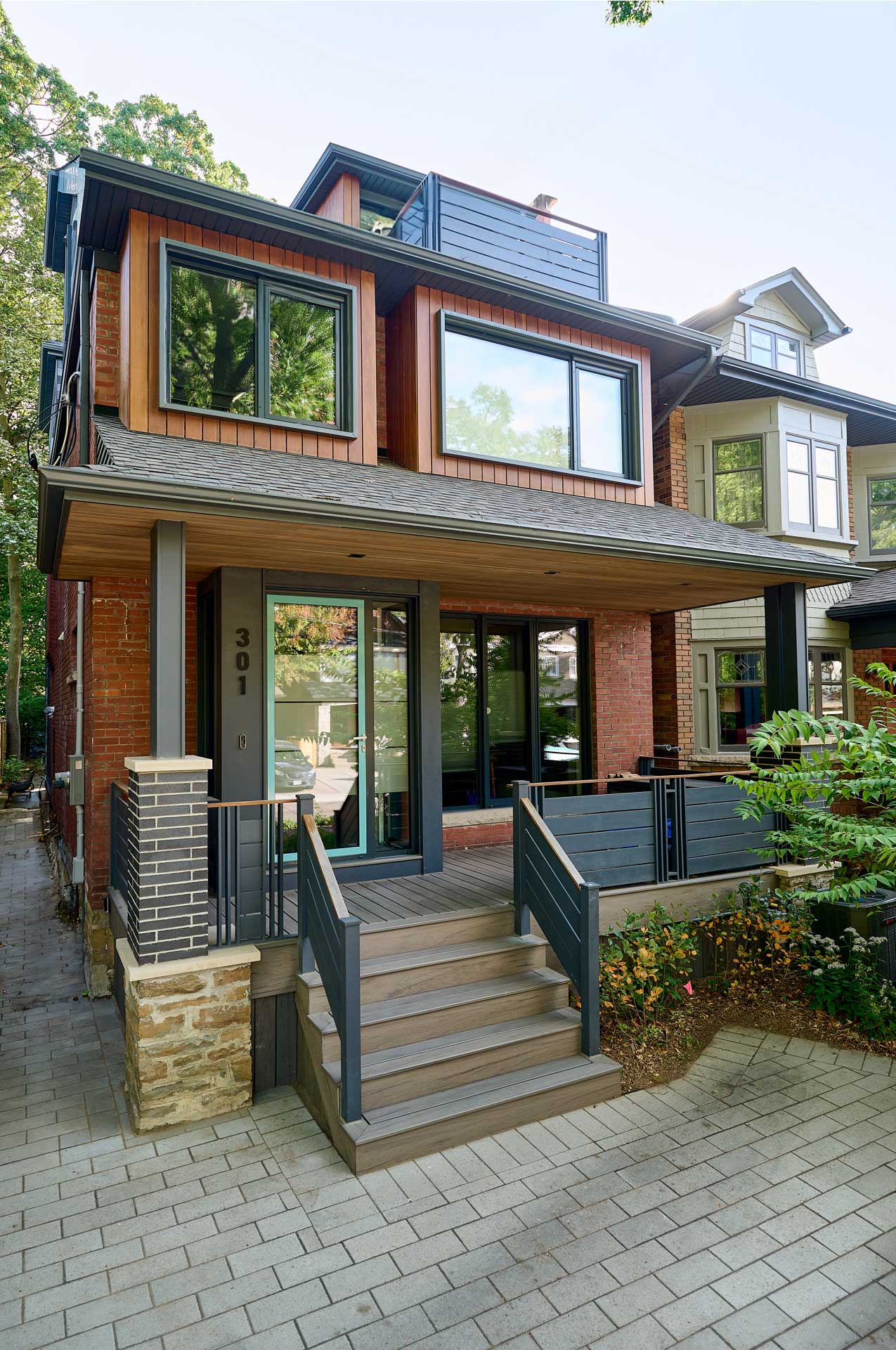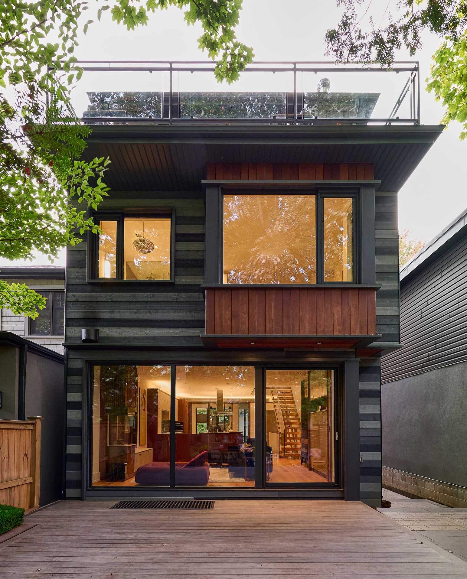 This transformation from an aging 2-storey house in Bloor West Village into a custom-built forever home was a long-awaited labor of love. The clients sought a modern home that would blend seamlessly into the street they had called home for 11 years. Bringing more natural light into the interior was a key priority achieved through strategic design choices. Relocating the stairs created a central shaft of light and unique spatial experience, enhanced by angled, north-facing skylights spanning from the new third floor down to the basement. A custom walnut kitchen, integrated lighting, discreet exterior spaces, sauna and steam rooms, and a sound-insulated music room are just a few of the many personalized details that make this home unique. The house was thoughtfully designed to accommodate the clients’ passions for cooking, entertaining, and environmental sustainability – featuring triple-glazed aluminum windows, radiant heated floors, a south-facing roof garden, and natural/vegan materials. It also provides ample space for guests and extended family as the clients’ children grow.